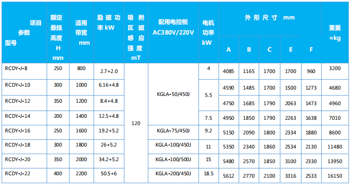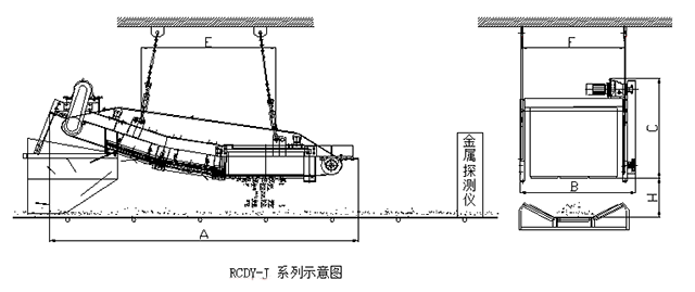 四、RCDY-J系列懸掛式組合回收型除鐵器主要技術(shù)參數(shù)、外形尺寸 執(zhí)行標準:JB/T7689、JB/T10885