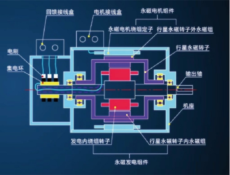 多功能雙永磁調(diào)速一體機是永磁電動機與永磁發(fā)電機嵌套集成的多功能電機。主要由內(nèi)繞組轉(zhuǎn)子、內(nèi)外雙永磁行星轉(zhuǎn)子及電機定子繞組組成,其中內(nèi)繞組轉(zhuǎn)子是輸出軸,永磁行星轉(zhuǎn)子的外永磁體與電機定子繞組電磁耦合形成永磁電機;內(nèi)繞組轉(zhuǎn)子與永磁行星轉(zhuǎn)子的內(nèi)永磁體電磁耦合形成發(fā)電機,控制內(nèi)繞組中的感生電流的大小控制轉(zhuǎn)子的輸出轉(zhuǎn)矩與轉(zhuǎn)速。并將內(nèi)繞組中多余能量通過集電環(huán)回饋至電網(wǎng)再利用。