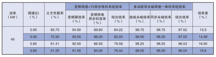 下表為與平方轉(zhuǎn)矩系統(tǒng)45kW-4(Y2系列異步電機使用變頻供電)同工況效率對比