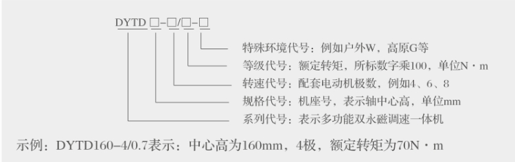 一體機型號由系列代號、規(guī)格代號、轉(zhuǎn)速代號、等級代號和環(huán)境代號五部分組成。